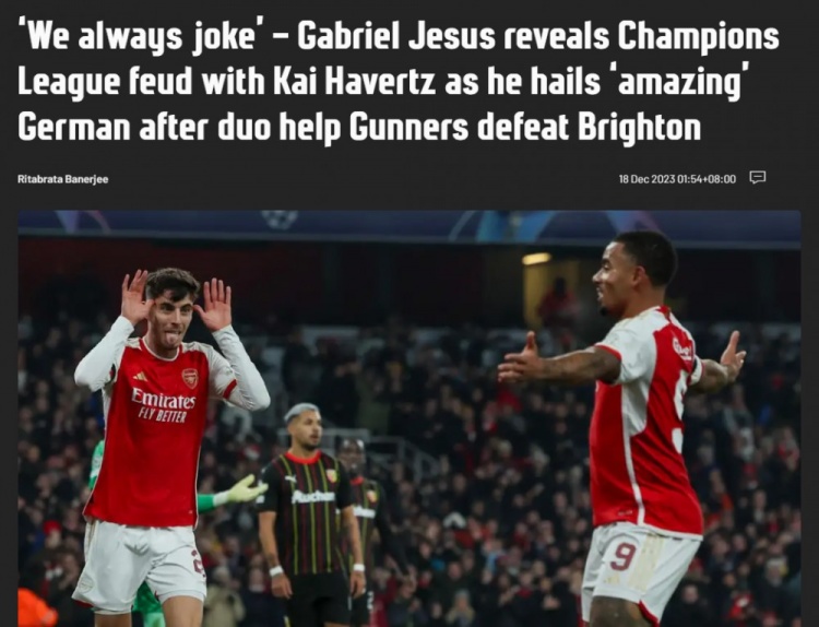 12月18日讯 英超第17轮,阿森纳主场2-0击败布莱顿,热苏斯和哈弗茨各入一球。赛后热苏斯接受采访时谈到他和哈弗茨的关系时说:“我们经常开玩笑聊到欧冠,他有欧