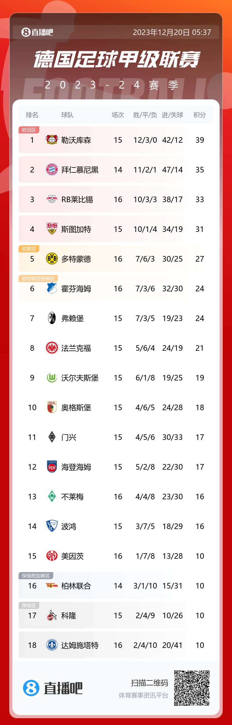 12月20日讯 德甲第16轮,莱比锡1-1被不莱梅逼平,多特主场1-1战平美因茨,遭遇四轮不胜,霍芬海姆3-3战平达姆施塔特。