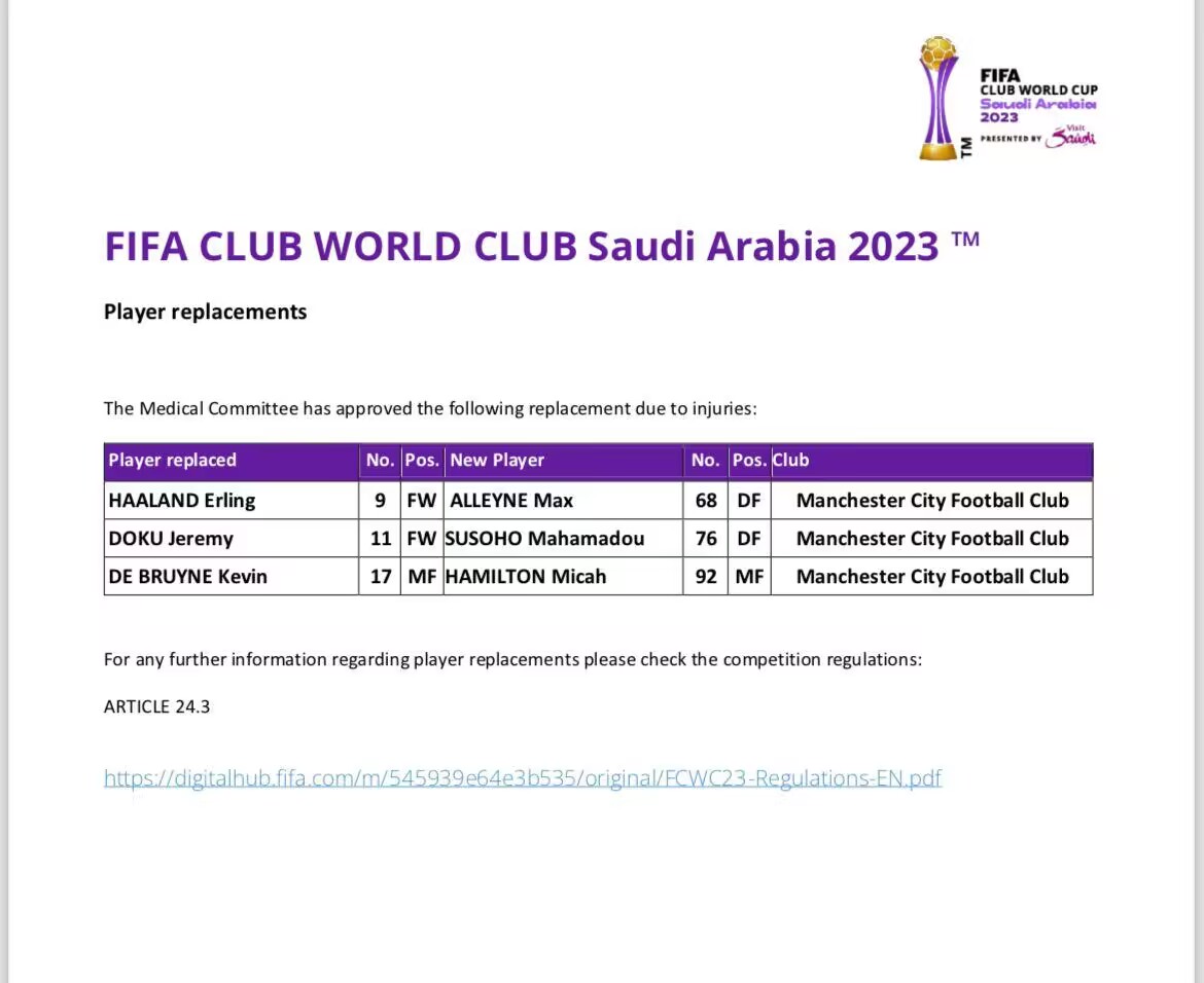 本场比赛,哈兰德、多库、德布劳内因伤被排除出世俱杯名单,阿莱尼、苏索霍、汉密尔顿代替他们入选。