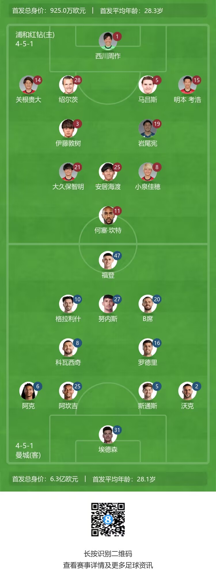 12月20日讯 世俱杯半决赛,曼城客场对阵浦和红钻。赛前,官方公布了本场的首发名单。