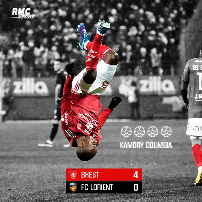 12月21日讯 本轮法甲,布雷斯特主场4-0大胜洛里昂!布雷斯特中场敦比亚一人半场狂轰四球!