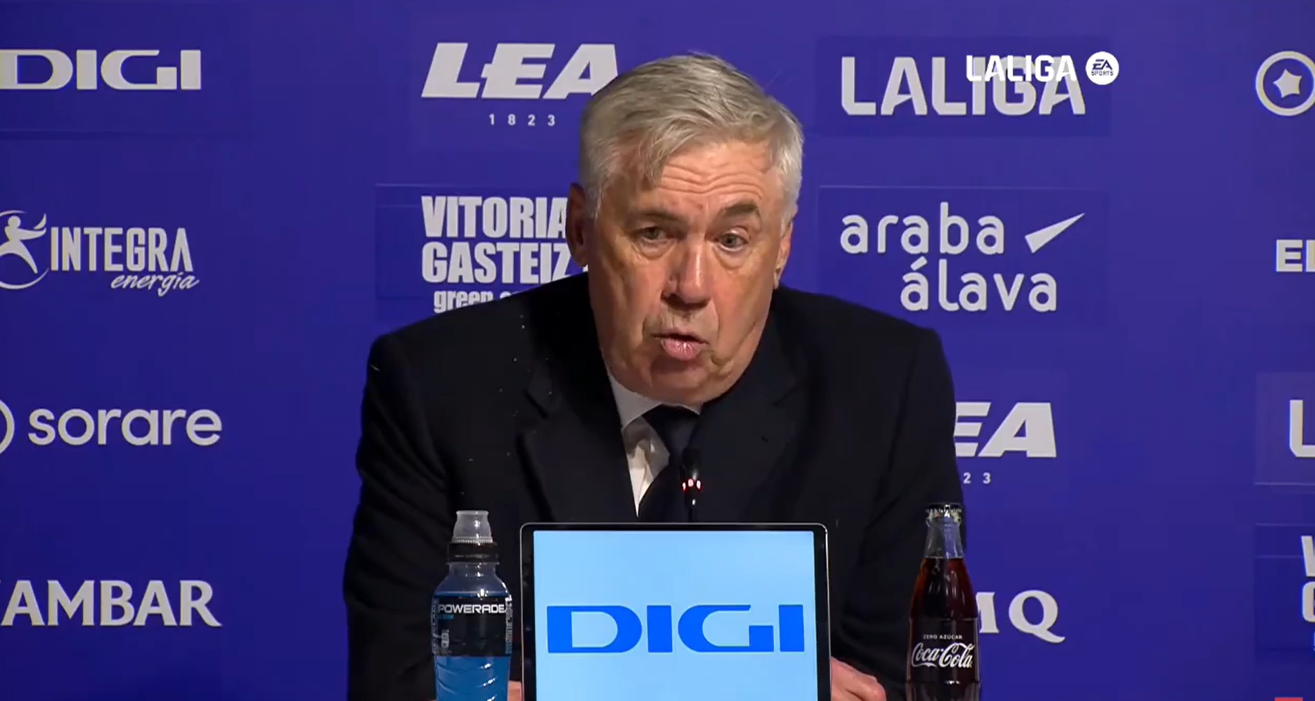 12月22日讯 西甲第18轮,十人皇马1-0阿拉维斯登顶,巴斯克斯补时绝杀。赛后,皇马主帅安切洛蒂出席了新闻发布会,他也被问到了关于欧超的话题。