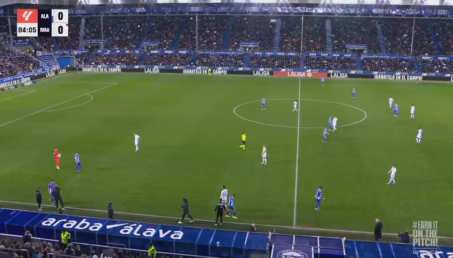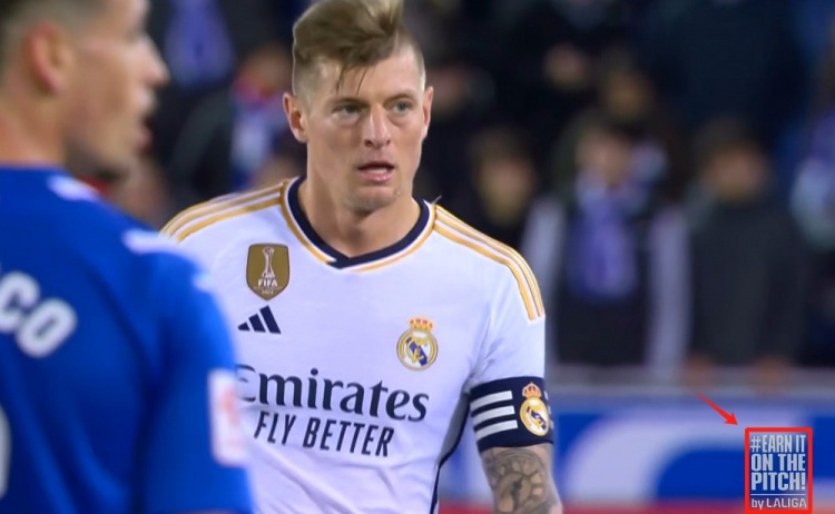 西甲本轮转播信号右下角贴上了反欧超标语水印——“Earn It On the Pitch”(在球场上赢得)。