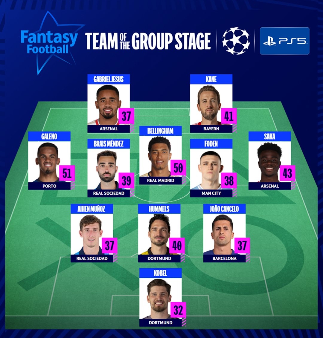 欧冠小组赛最佳阵容:凯恩、热苏斯搭档锋线,贝林、萨卡在列