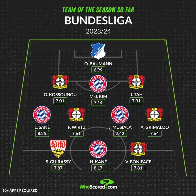 12月22日讯 德甲16轮战罢,《whoscored》评选出了本赛季迄今为止德甲最佳阵,凯恩等拜仁4将入选,勒沃库森贡献5将。