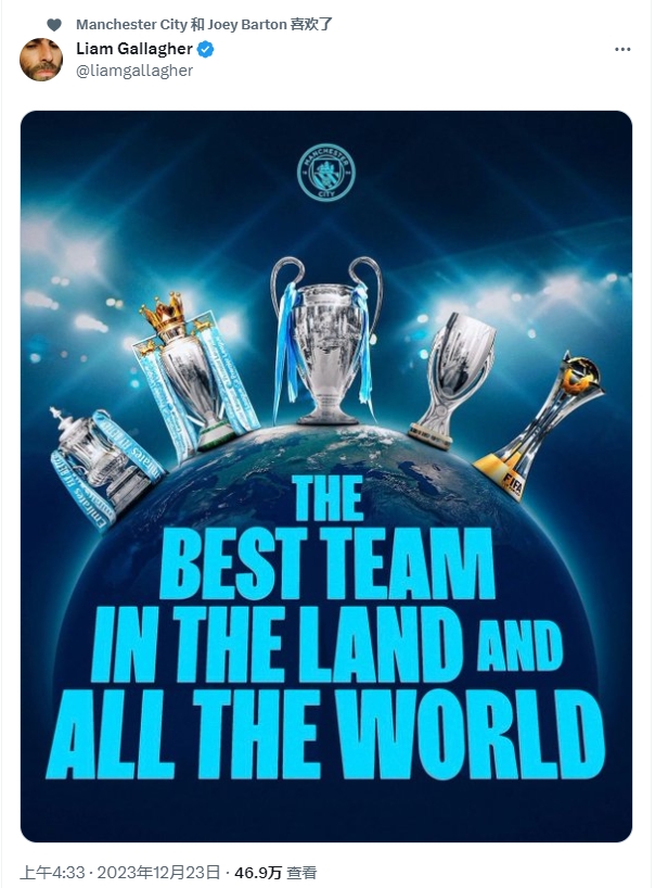绿洲主唱Liam Gallagher在曼城夺得五冠王后发推:这是地表以及全世界最佳球队。曼城官方点赞!