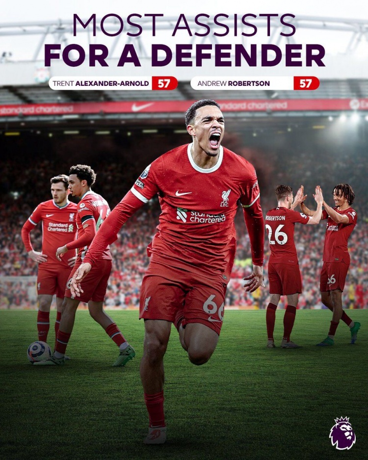 据英超官方统计,这是阿诺德在英超中送出的第57次助攻。他追平了自己的队友罗伯逊,并列英超历史上助攻最多的后卫。