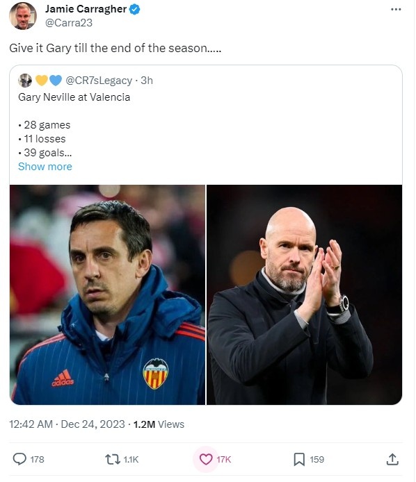 加里-内维尔的同事&损友卡拉格对此调侃表示道:赛季末给内维尔些执教时间吧。