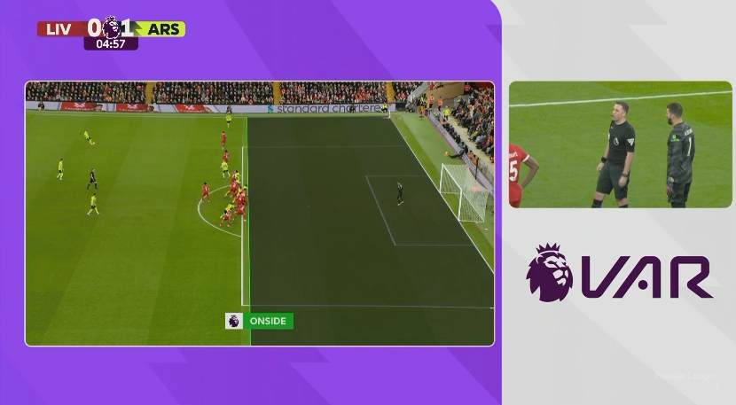 12月24日讯 英超利物浦vs阿森纳第4分钟,厄德高定位球助攻,加布里埃尔破门,VAR回看后确认不越位!阿森纳先入一球,比分变为阿森纳1-0。