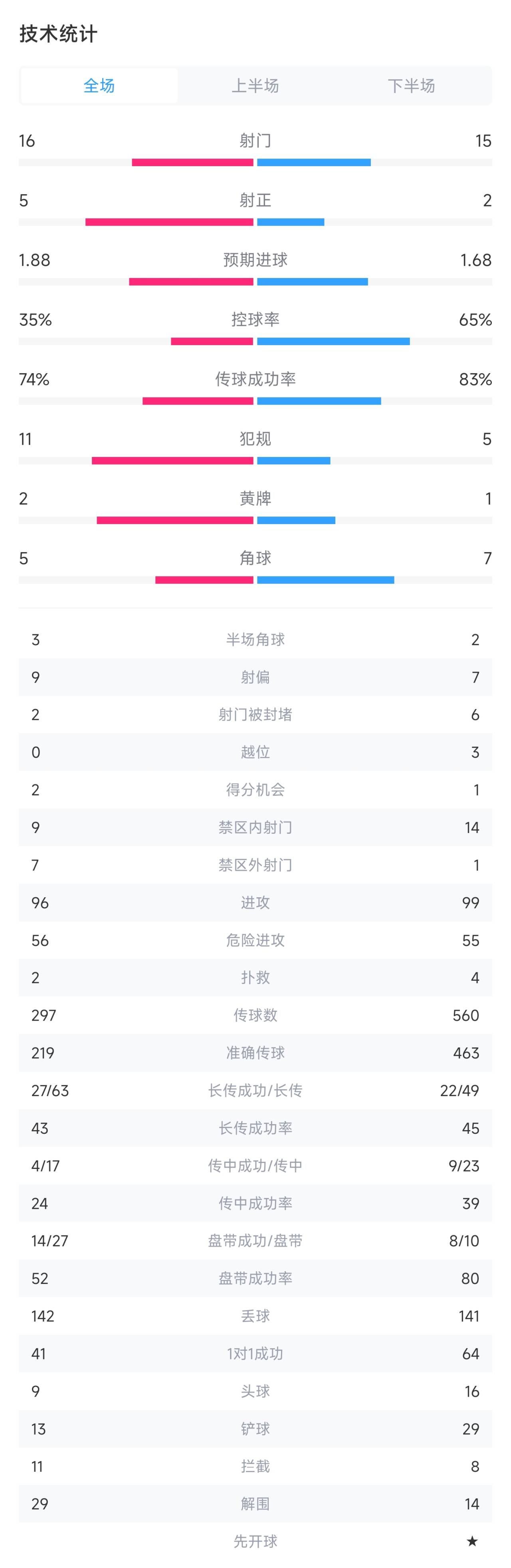 卢顿1-0纽卡全场数据:射门16-15,射正5-2,控球率35%-65%