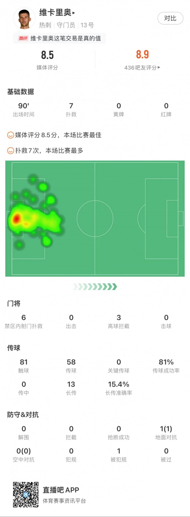 维卡里奥全场7次成功扑救,2次成功出击,获评8.5分全场最高