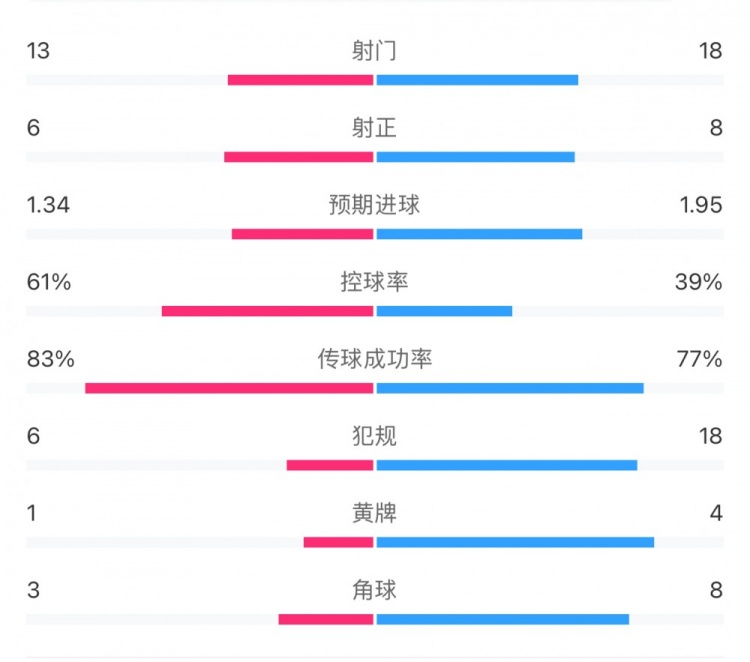 热刺2-1埃弗顿全场数据:射门13-18,射正6-8,犯规6-18