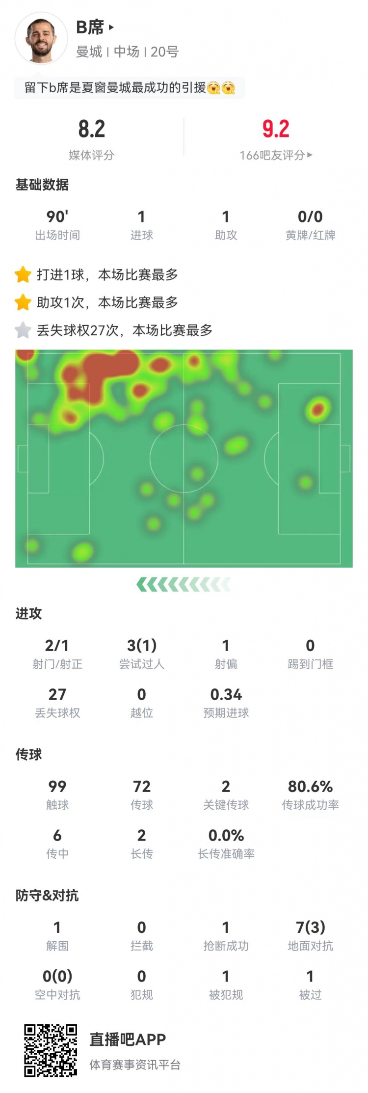 传射建功!B席数据:2射1正1进球 2次关键传球1助攻 评分8.2