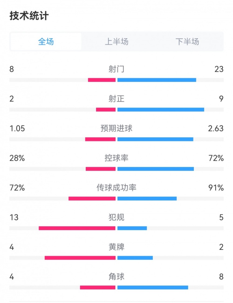 埃弗顿1-3曼城数据对比:射门8-23,预期进球1.05-2.63