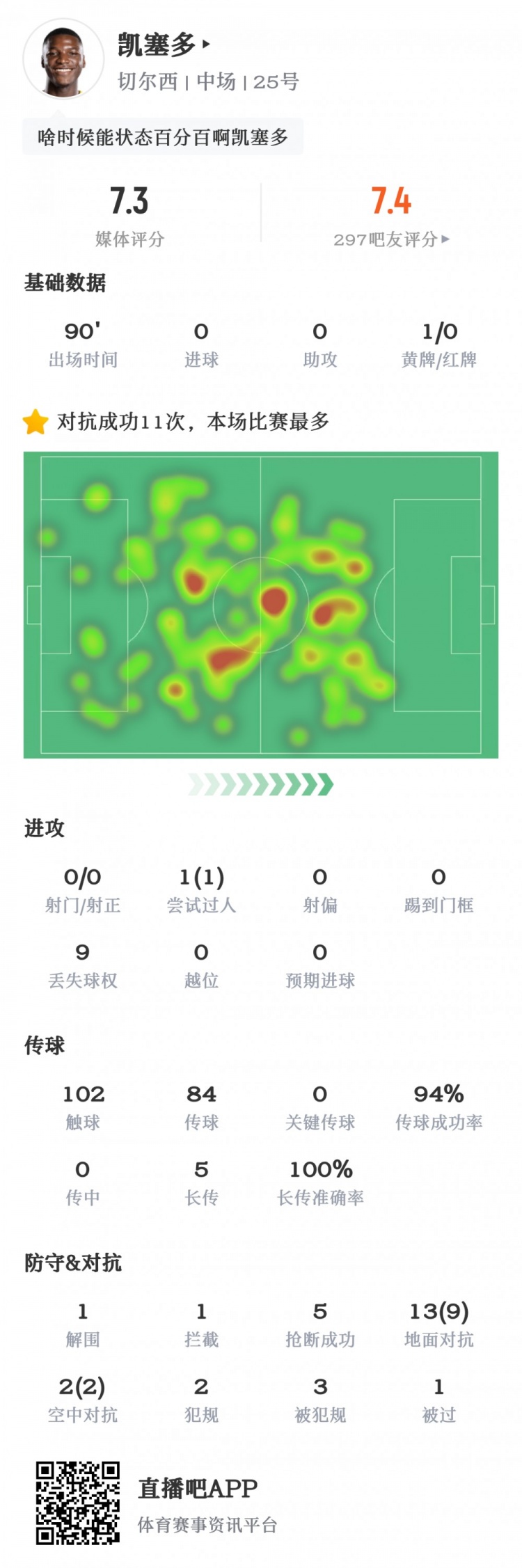 凯塞多数据:抢断次数、对抗成功次数均全场最多,获评7.3分