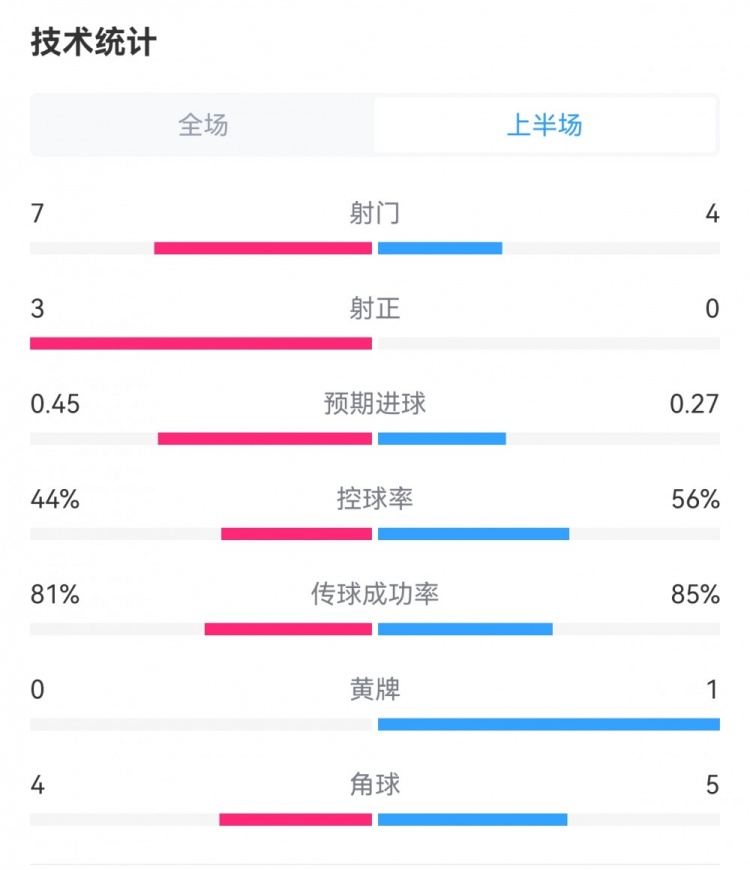 1月5日讯 本轮西甲,巴萨半场0-1落后拉斯帕尔马斯。双方数据对比如下(拉斯帕尔马斯在前)↓射门7-4射正3-0预期进球0.45-0.27控球率44%-56%传球成功率81%-85%黄
