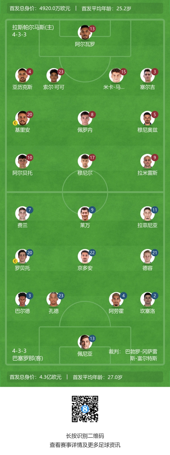 拉斯帕尔马斯首发:13-阿尔瓦罗-瓦莱斯、3-卡尔多纳、4-亚历克斯-苏亚雷斯、15-米卡-马尔莫尔、23-萨乌尔-科科、5-哈维-穆尼奥斯、8-法比奥-冈萨雷斯、10-阿尔贝托-莫莱罗、20-基里安·罗德里格斯、9-桑德罗-拉米雷斯、17-穆尼尔-哈达迪