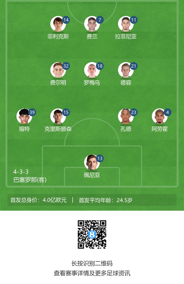 巴萨首发:13-佩尼亚、4-阿劳霍、15-克里斯滕森、23-孔德、39-赫克托-福特、18-罗梅乌、21-德容、32-费尔明、7-费兰-托雷斯、11-拉菲尼亚、14-菲利克斯