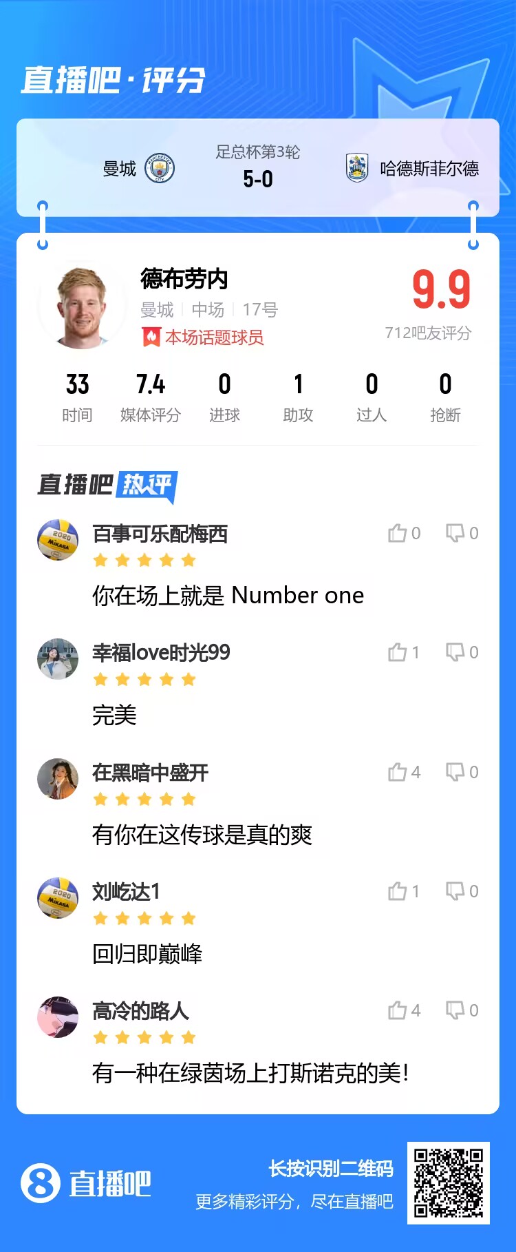 足总杯第三轮,曼城5-0大胜哈德斯菲尔德。德布劳内时隔5个月重返赛场,复出即献大师级助攻。快来一起为德布劳内评分吧!赛后吧友评分↓