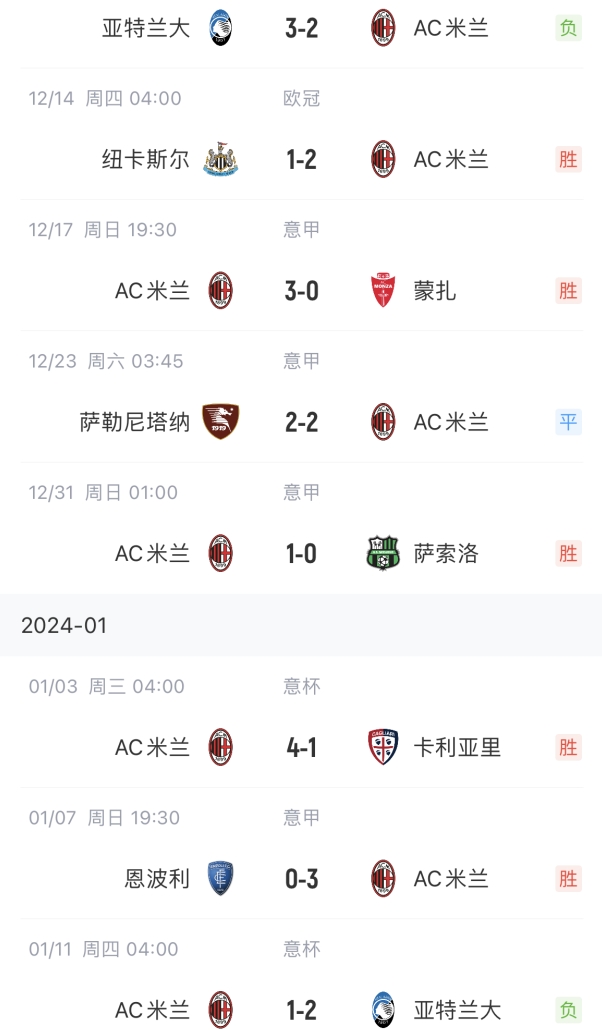 1月11日讯 意杯赛场,米兰1-2不敌亚特兰大止步1/4决赛。米兰各赛事6场不败被终结。米兰上一次输球,也是输给亚特兰大,当时米兰在联赛2-3不敌亚特兰大。下一场,