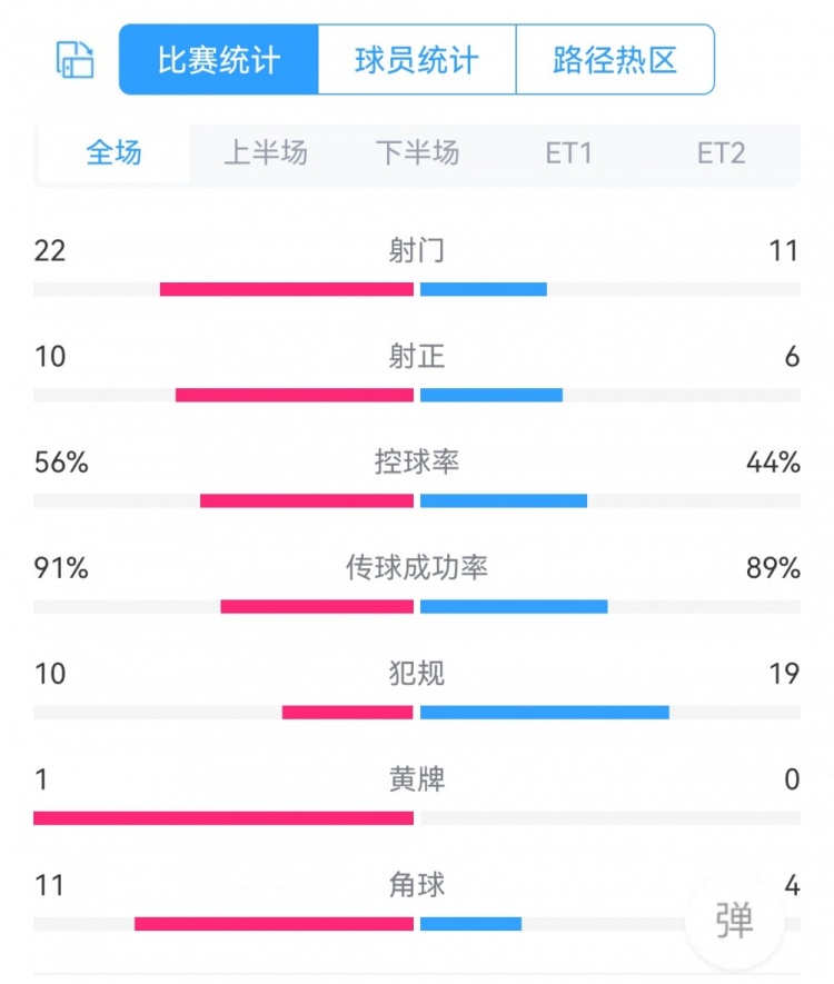 1月11日讯 西超杯半决赛,皇马加时鏖战5-3力克马竞晋级决赛。双方全场数据对比如下↓射门22-11射正10-6控球率56%-44%传球成功率91%-89%犯规10-19黄牌1-0角