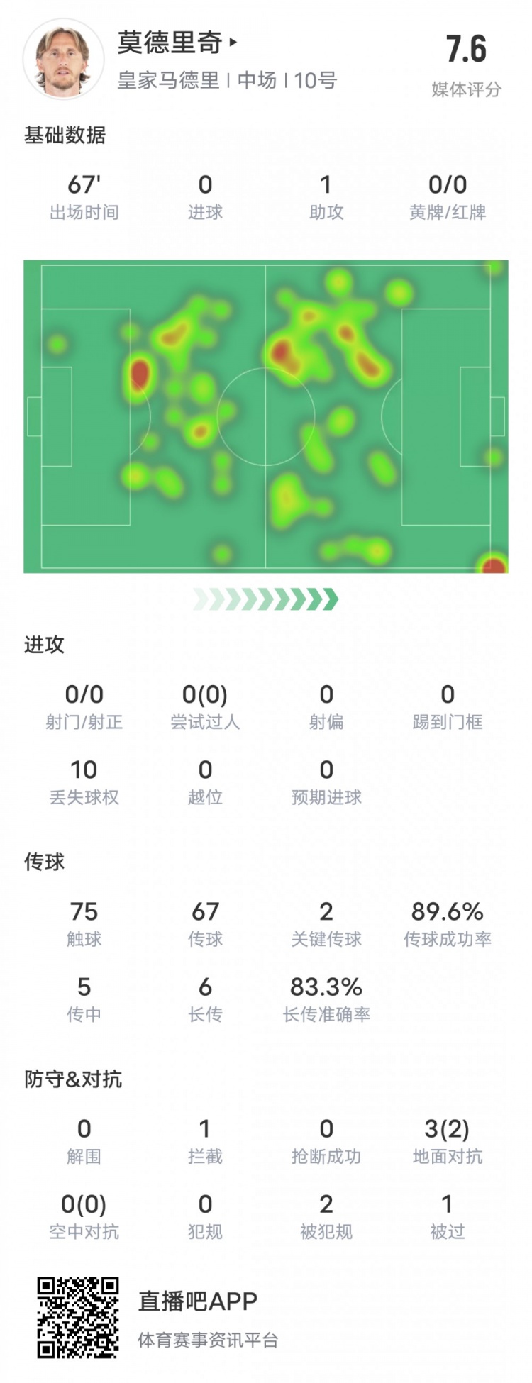 莫德里奇本场对阵马竞数据:1助攻2关键传球,评分7.6