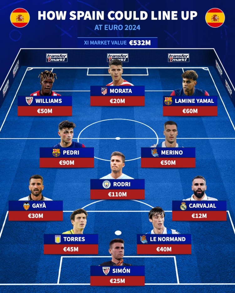 德转列西班牙欧洲杯潜在首发阵容(总价5.32亿欧)