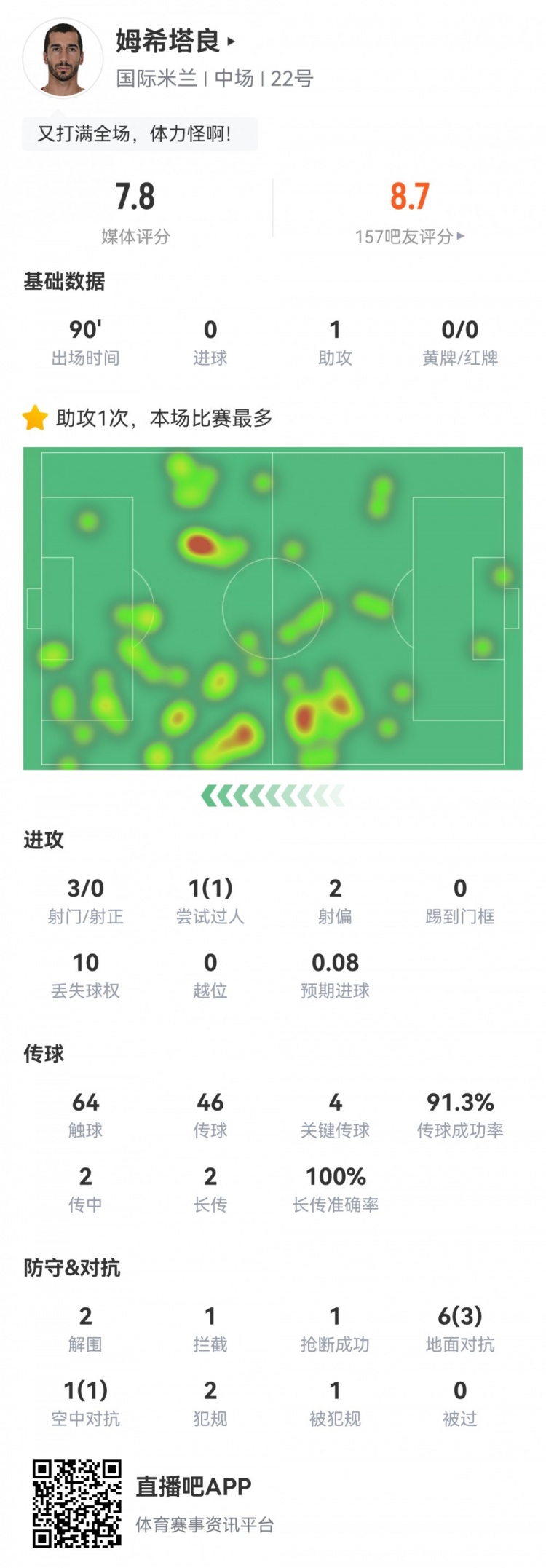 1月14日讯 本轮意甲国米5-1客胜蒙扎,即将年满35岁的姆希塔良首发打满全场并贡献一次助攻,球员全场重点数据如下↓