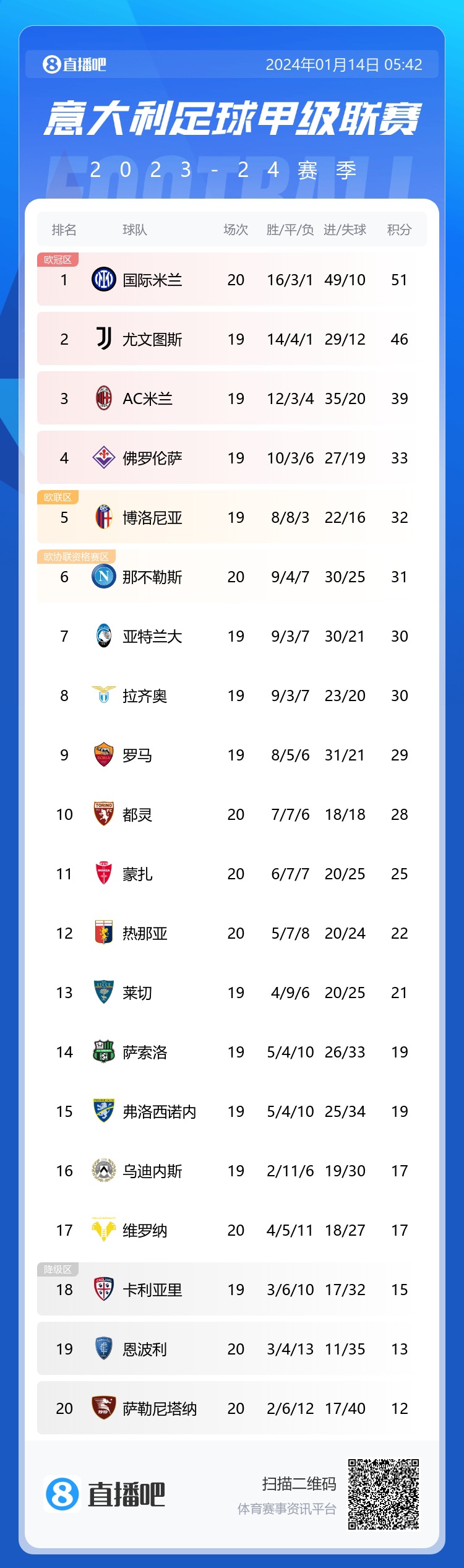 1月14日讯 本轮意甲,国米击败蒙扎,联赛20场积51分第一。尤文本轮未赛,积46分第二。
