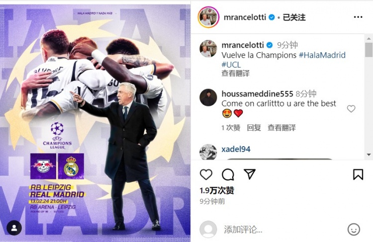 2月13日讯 欧冠淘汰赛开赛在即,安切洛蒂更新社媒预热。