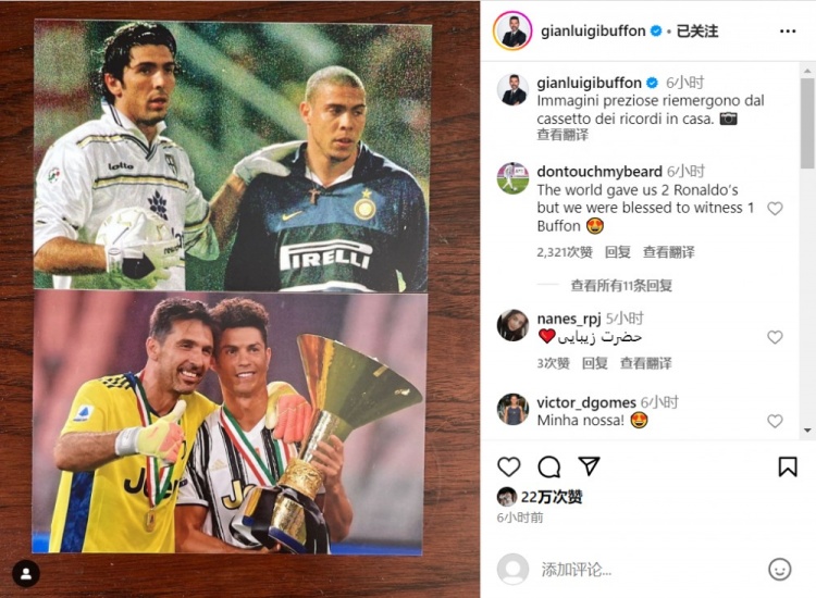 布冯晒出了自己效力帕尔马时期与效力国米时期大罗的合影,还有在尤文时期与C罗的捧杯照,并配文:从家里的记忆抽屉里重新浮现出来的珍贵影像