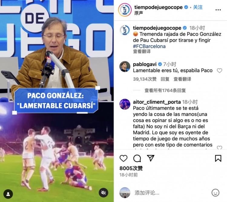Paco González表示17岁的小将在比赛中并没有被对方踩踏到,却假装抱怨受伤。对此巴萨中场加维在评论区会怼该解说员:你才是真可怜啊,醒醒吧,帕科!