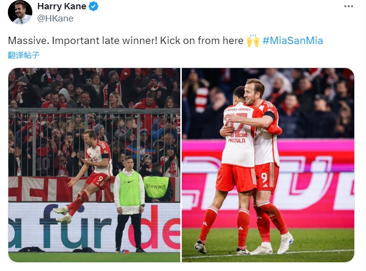 2月25日讯 德甲第23轮,凭借凯恩的梅开二度,拜仁主场2-1绝杀莱比锡。赛后,进球功臣凯恩更新动态,庆祝了这场胜利。凯恩晒出自己庆祝进球时的照片,并写道:非常关键