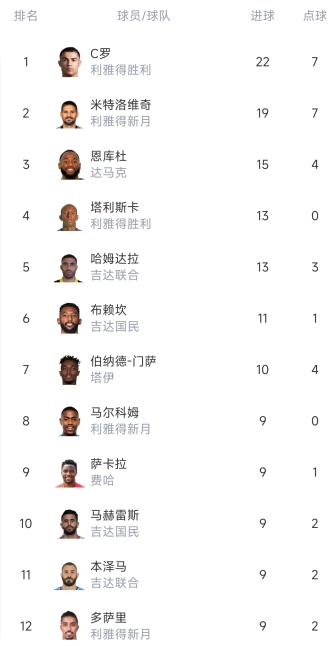 射手榜方面,C罗22球领跑,米特洛维奇19球第二,恩库杜15球第三。