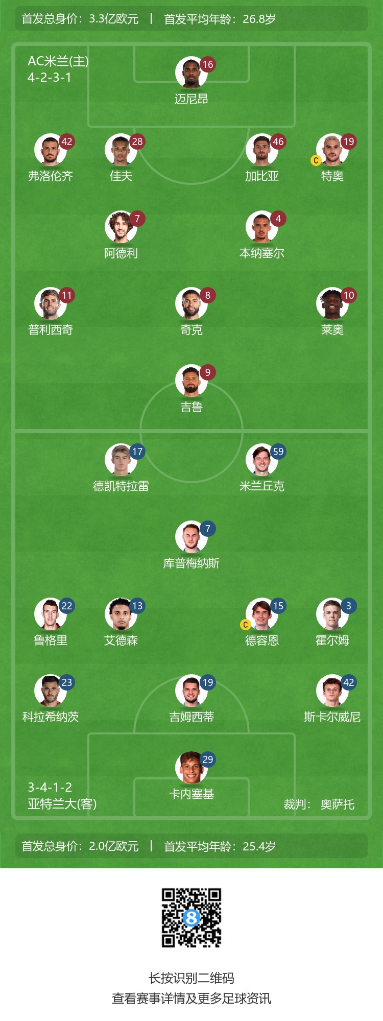 亚特兰大首发:29-卡内塞基、23-科拉西纳茨、19-吉姆西蒂、42-斯卡尔维尼、22-鲁杰里、13-埃德森、15-德容恩、3-霍尔姆、7-库普梅纳斯、17-德凯特拉雷、59-米兰丘克