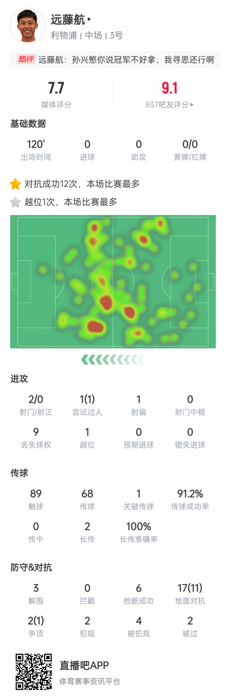 无惧大场面!远藤航数据:6抢断3解围对抗成功率63%,获评7.7分