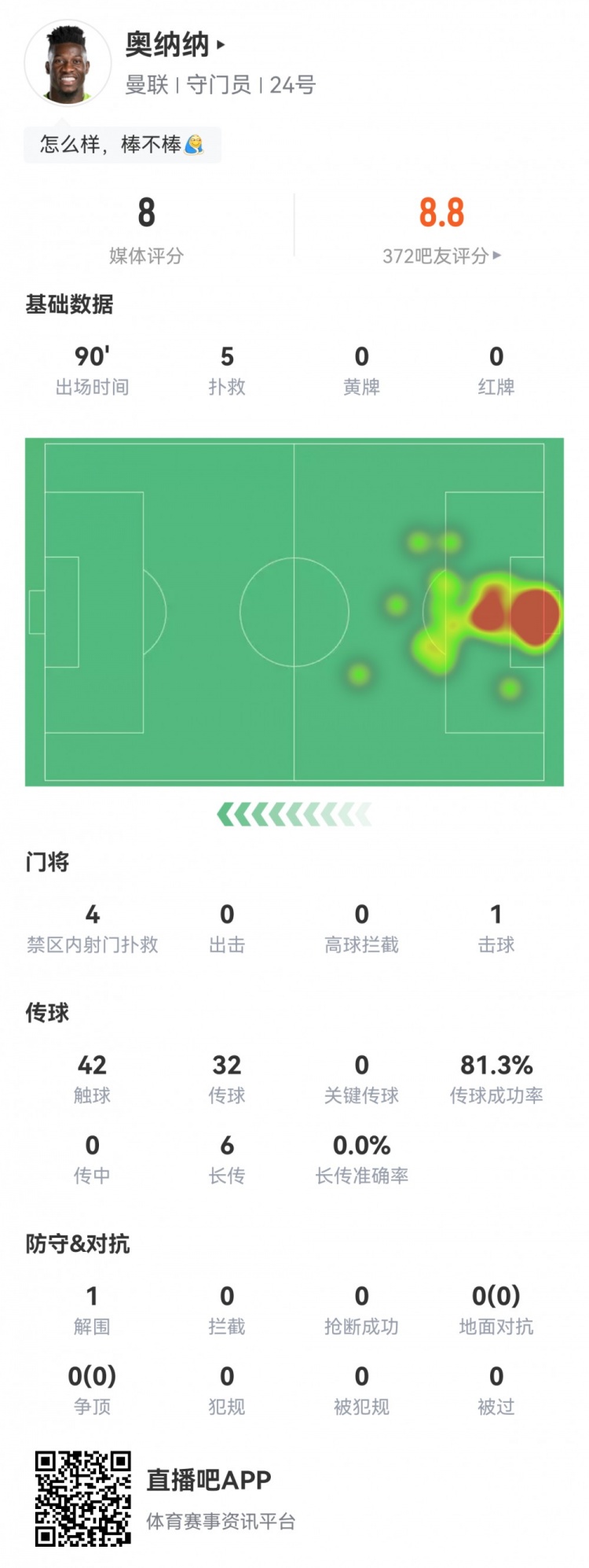 奥纳纳本场数据:5次扑救,1次解围,获评全场并列第二高8.0分