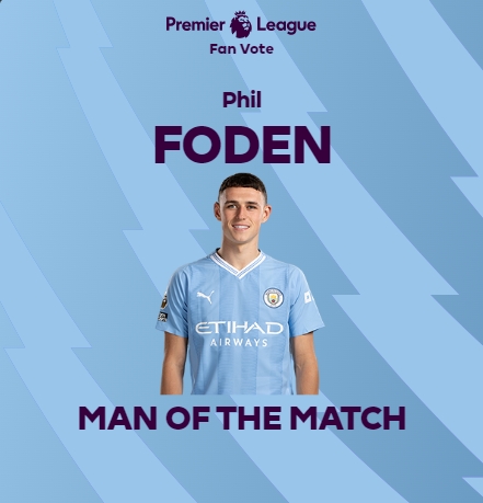 实至名归!英超官方:福登当选曼市德比全场最佳,本场梅开二度