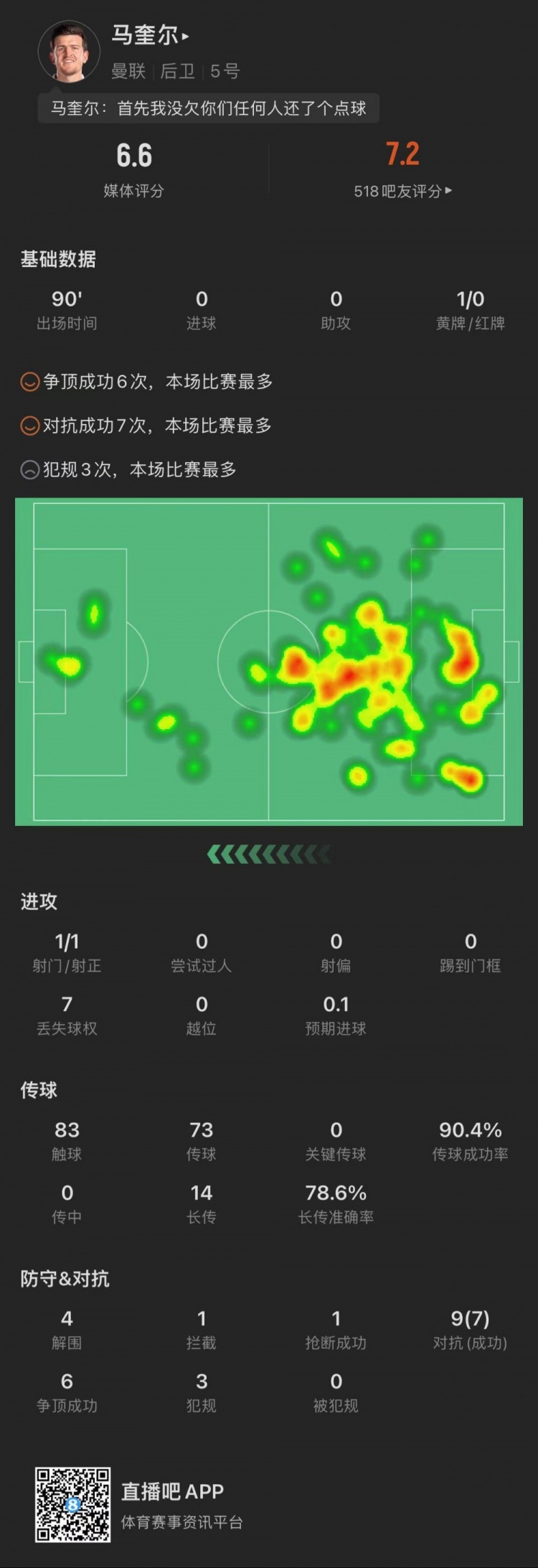 马奎尔全场数据:1次被判点球,4次解围,7次赢得对抗