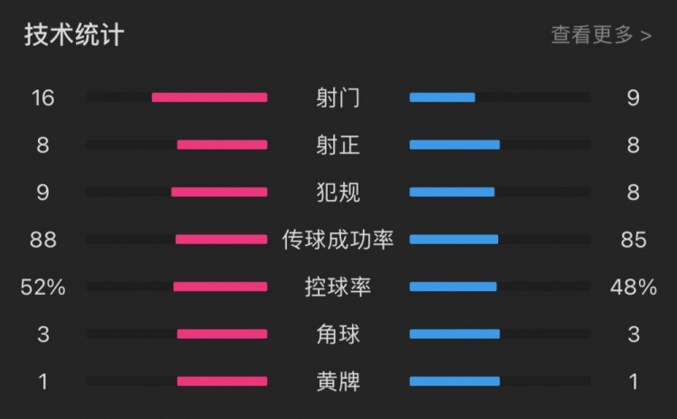 11月9日讯 欧冠小组赛第4轮,哥本哈根4-3战胜曼联,两队全场数据:(曼联在后)射门:16-9射正:8-8犯规:9-8传球成功率:88%-85%控球率:52%-48%角球:3-3犯规:9-9黄牌:1-1红牌:0-