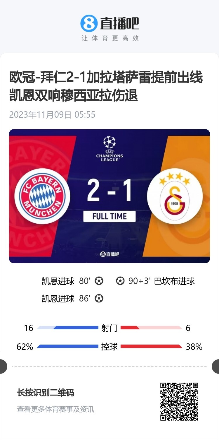拜仁2-1加拉塔萨雷全场数据:射门16比6,控球率62%比38%