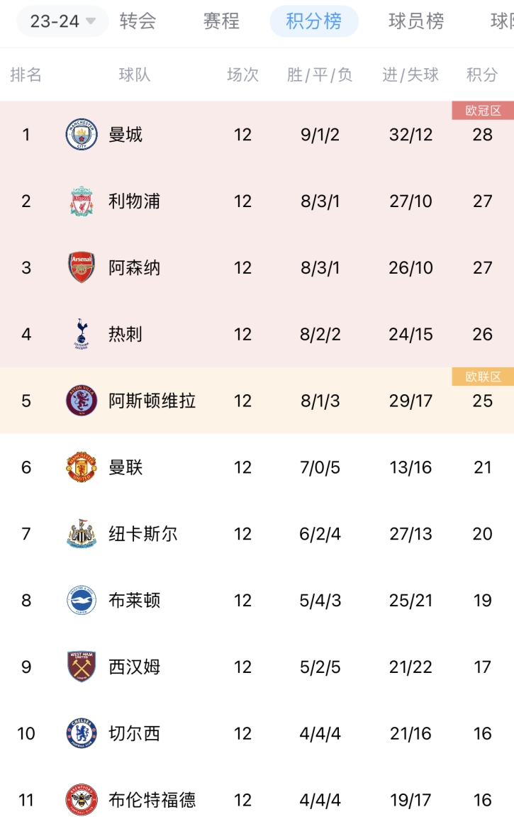 维拉25分第五,曼联21分第六,纽卡20分第七。