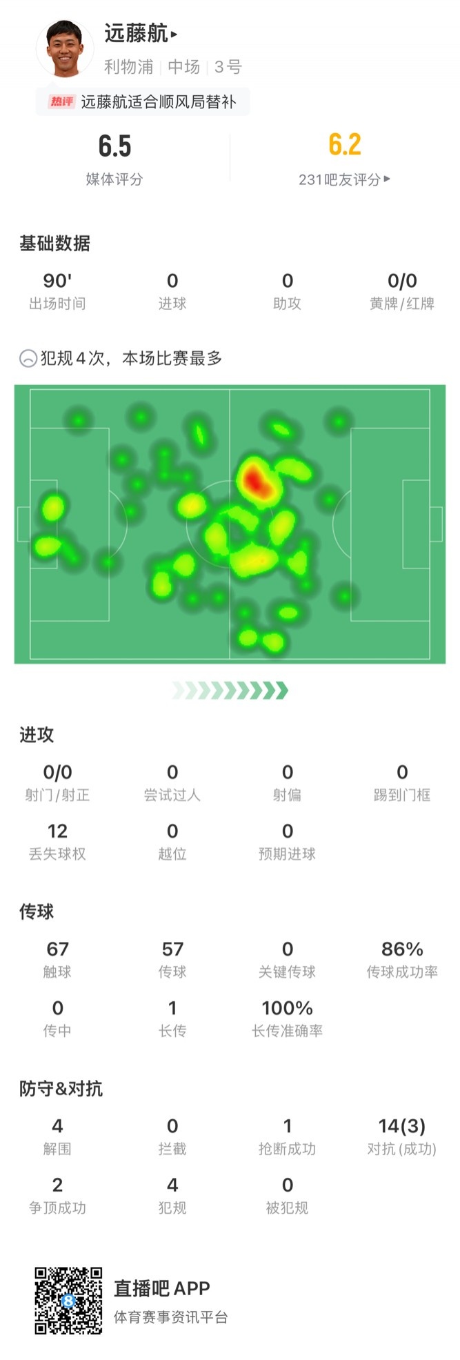 远藤航本场数据:12次丢失球权,14次对抗成功3次,获评6.5分