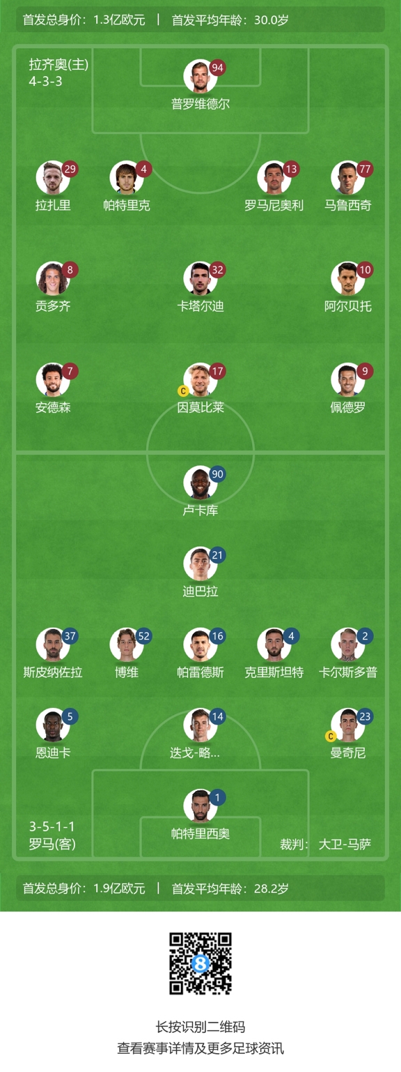 拉齐奥首发:94-普罗维德尔、4-帕特里克、13-罗马尼奥利、29-拉扎里、77-马鲁西奇、8-贡多齐、10-阿尔贝托、32-卡塔尔迪、7-费利佩-安德森、9-佩德罗、17-因莫比莱