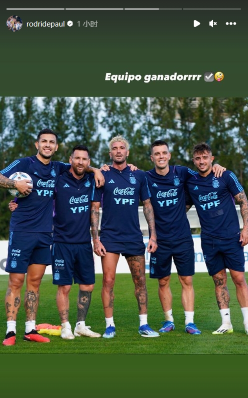 德保罗在社媒上晒与梅西、帕雷德斯、洛塞尔索、马菲奥合照,配文:赢球小分队
