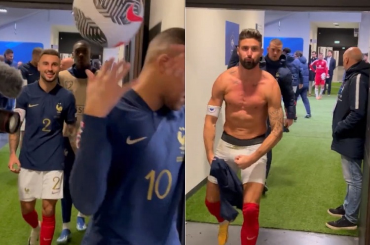 赛后法国球员们心情十分不错,在返回更衣室的途中,本场比赛上演帽子戏法的姆巴佩把比赛用球丢给了身后的克劳斯,吉鲁则是对着镜头晒起了肌肉。