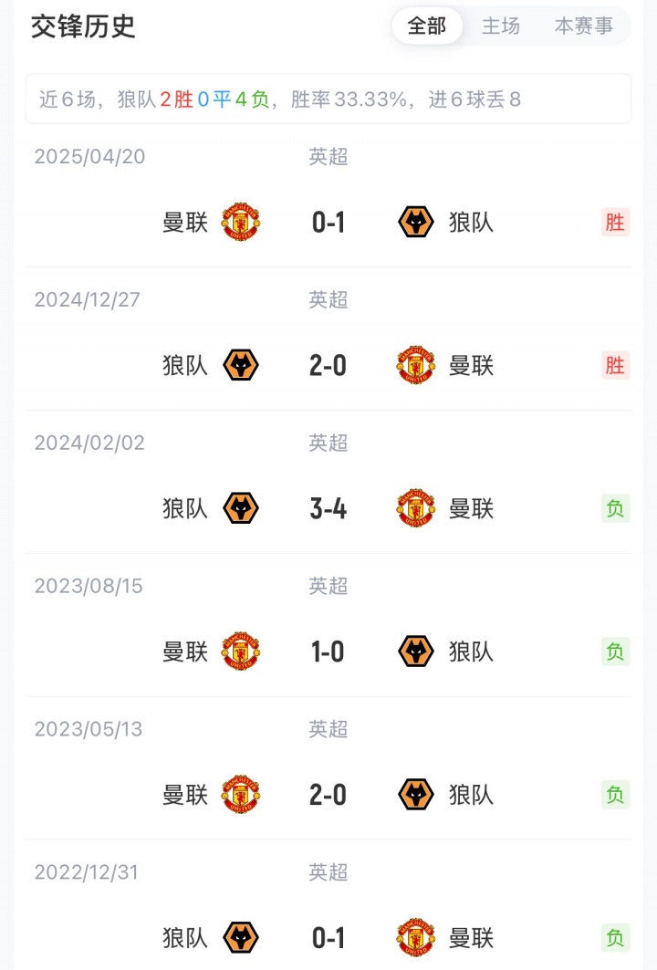 曼联暂以22分排名英超第十二。狼队本赛季英超还未尝一胜,暂以2分排名倒数第一。