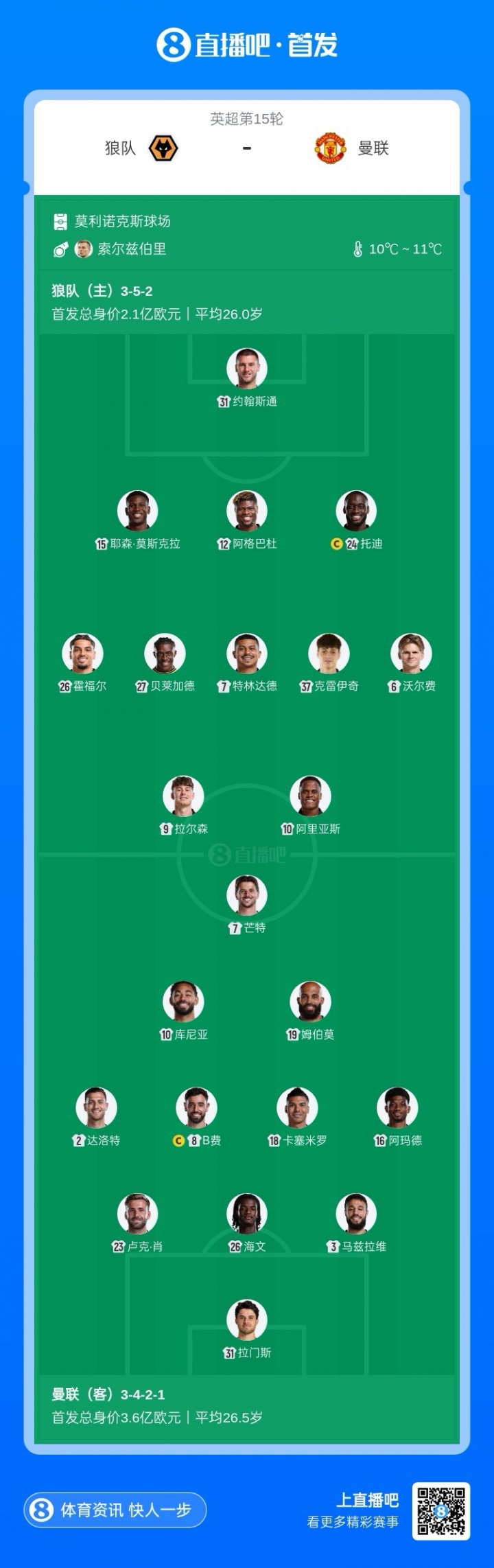 12月9日讯 英超第15轮,曼联客战狼队,赛前首发公布。