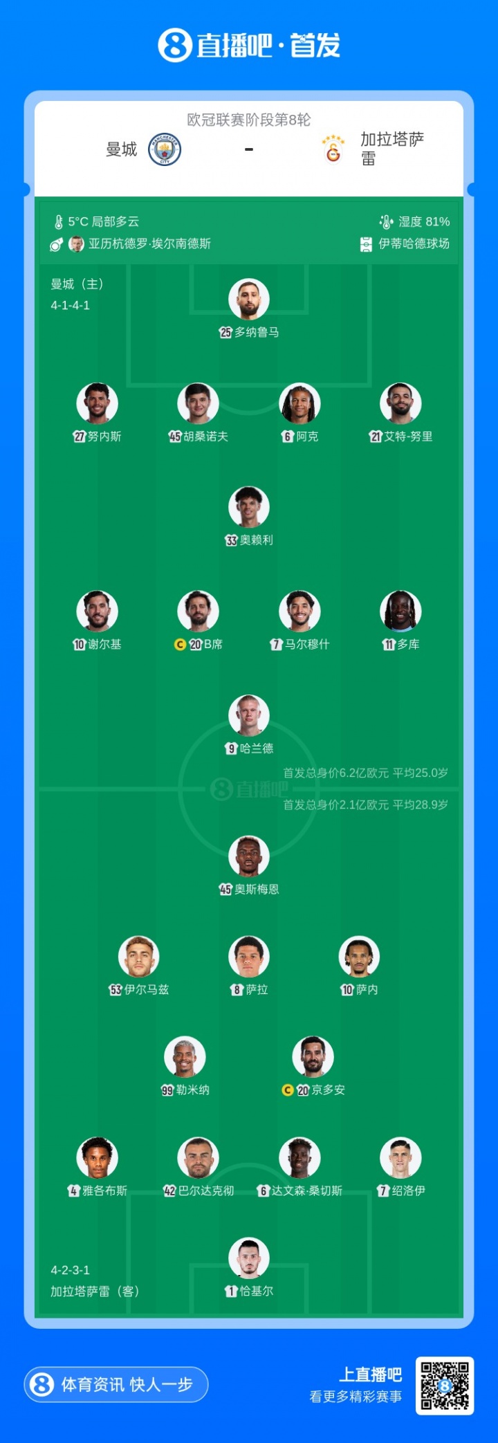 - 曼城vs加拉塔萨雷首发:萨内京多安战旧主!哈兰德、马尔穆什先发