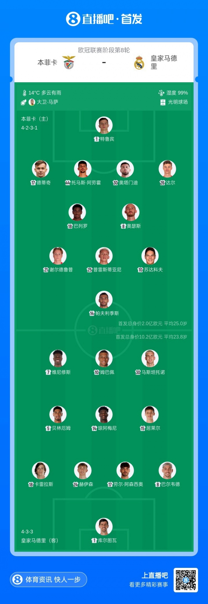 - 穆帅战旧主!皇马vs本菲卡首发:姆总领衔,琼阿梅尼、居莱尔先发